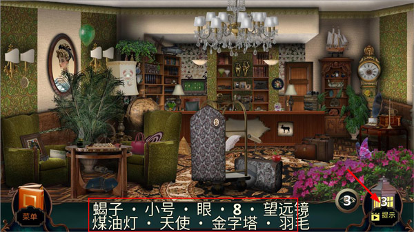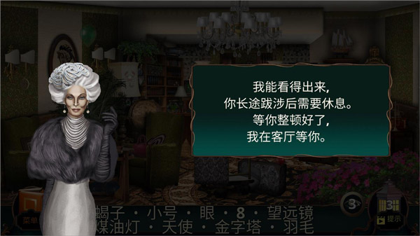 3、根据游戏下方的提示在接待厅收集需要的物品,,玩家还可以根据右下角的提示找到物品;