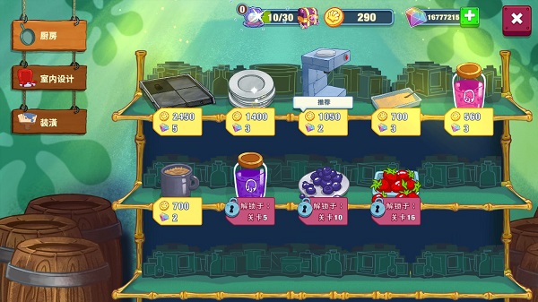 5、但是又有很多厨具和装饰升级时间很短,这个没有进行良好的设计,导致游戏中出现了很对卡关的情况。