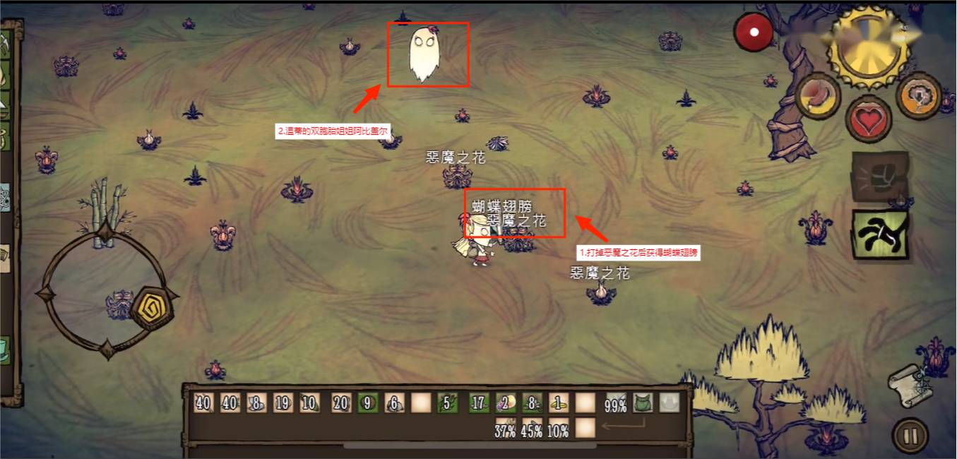 2、放下后随意攻击一朵恶魔之花,会掉落蝴蝶翅膀,这个时候阿比盖尔之花就变成灵魂状态,温蒂的姐姐就被召唤出来了。