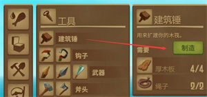第一步:制作木锤,所需材料为4块厚木板和2根绳子,集齐材料即可制作。