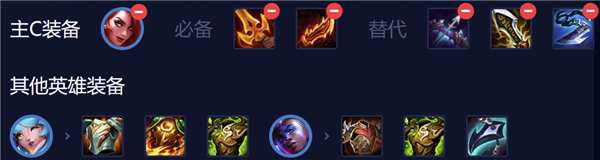 虚空恐惧有着超大范围的控制,我们给他坦度装备让他能够多次放出技能,日炎这件装备是前期过度时用的装备,打工神器不用多说。板甲能让他在被集火时有高额的双抗。