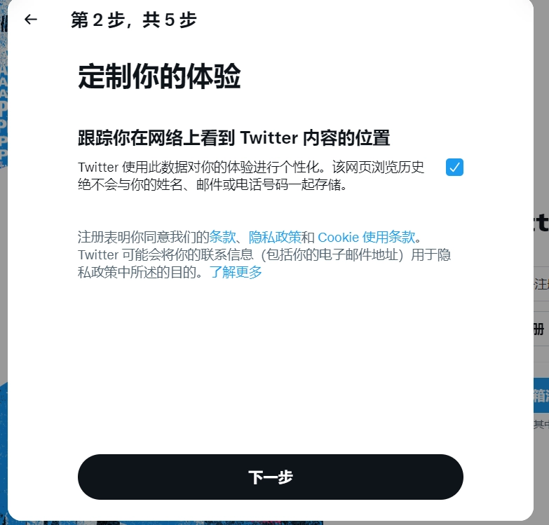默认打上勾即可,跟踪你在网络上看到 Twitter 内容的位置,Twitter 使用此数据对你的体验进行个性化。该网页浏览历史绝不会与你的姓名、邮件或电话号码一起存储。