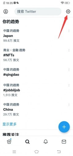 1、首先在推特X的搜索栏点击右上角的设置标志,如图所示。