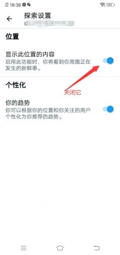 2、在搜索设置中“显示此位置的内容”这一栏关闭掉右侧的蓝色按钮。