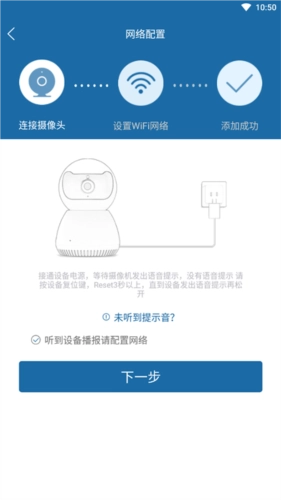 2、第一种方法,通过输入WiFi密码进行配网连接,连接过程中请确保路由器、摄像头和手机之间无遮挡并相互距离在2米内,在接通设备电源后,等待摄像机发出语音提示,没有语音提示请 按设备复位键,Reset3秒以上,直到设备发出语音提示再松开。