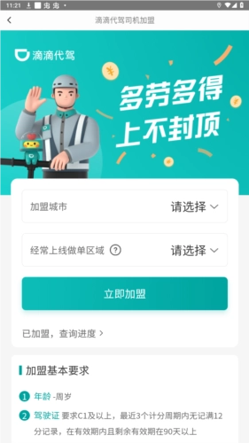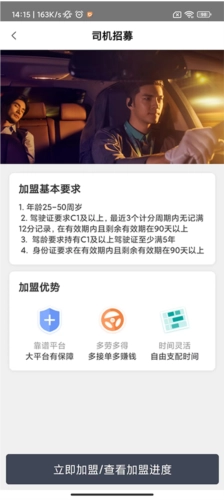 3、进入司机招募界面,这里提供了最基础的加盟要求,符合要求即可点击下方去申请;