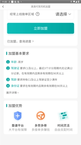 4、进入滴滴代驾后,下滑即可看到最基础的加盟流程。