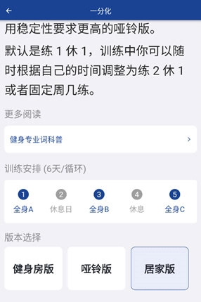 2、点击健身计划,在这里可以查看该健身类型的介绍和制定计划,可以按照自己的情况设置健身房版、哑铃版、居家版。