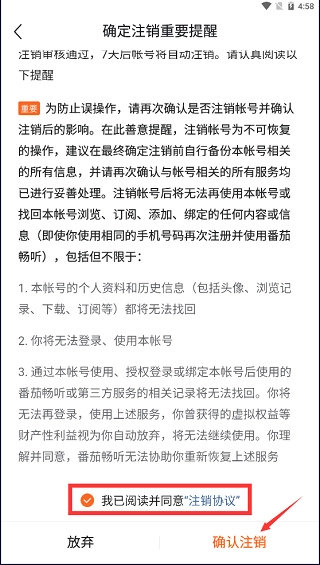 6、确定注销重要提醒后点击“我已阅读并同意‘注销协议’”,再点击“确认注销”按钮