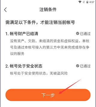3、勾选“我已阅读并同意‘注销协议’”,随后点击“下一步”