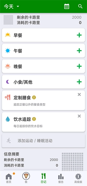 3、运动日记:记录并计算各类运动所消耗的卡路里。