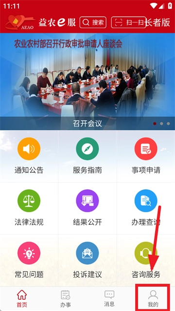 请在本站完成益农e服的安装与打开操作,待进入首页后,点击“我的”选项。