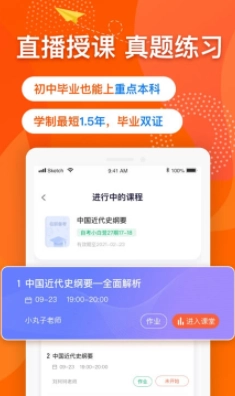 「VIP课程」:提供专业的成人自考、职业资格证书培训课程,热点、难点、易错点一网打尽。同时,随课附带相应的长达一年的课程表、学习资料、课件、随堂考、录播课程;即使没有时间参加直播课程学习,还可以利用碎片化时间、通过手机随时随地进行学习。