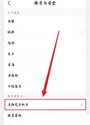 4、随后,点击账号与安全里的【未绑定手机号】选项。