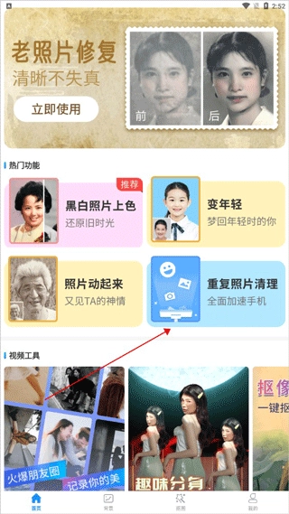 1. 开启软件,轻点“首页”选项,接着轻点“重复照片清理”选项。