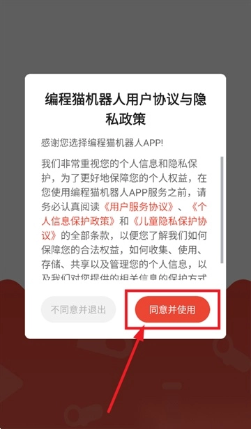 1. 安装并打开编程猫机器人,先同意并使用编程猫机器人用户协议与隐私政策