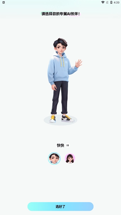 请挑选属于你的专属AI伙伴!比如,若你像小编一样选择问问,就点击问问的头像,切换至问问角色,随后点击“选好了”按钮。