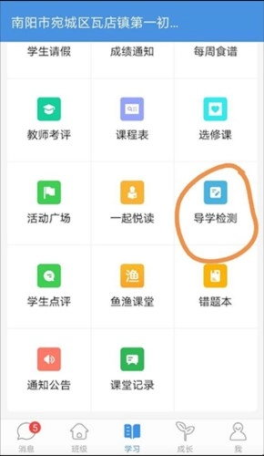 5、点击“学习”选项,随后进入“导学检测”界面,在此界面中观看与学习相关的课程。