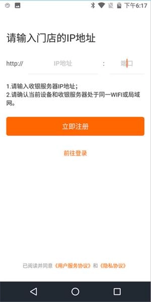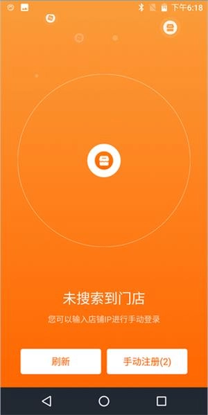 2、在30S倒计时结束前点击“切换手动注册”按钮,直接进入手动注册页,如图;手动输入店铺IP地址和端口号,点击“立即注册”按钮即可注册成功进入登录页