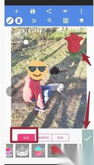 4、点击“帖纸”,选择您想要加入的帖纸,放置合适的位置和调节大小,点√号保存,显得更漂亮。