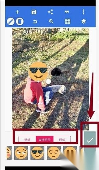 3、点击“表情”,选择您想要加入的表情,放置合适的位置,点√号保存,显得更有趣。