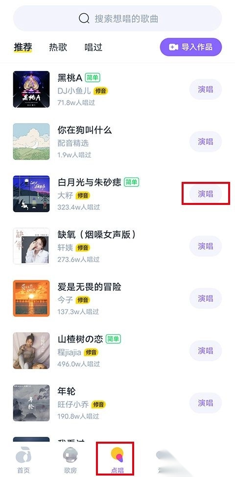 1、第一步要录制一个作品,在“点唱”页面挑选一首想唱的歌曲,然后点击“演唱”。