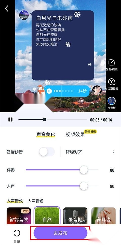 3、进入歌曲编辑阶段,可以调整声效,不满意还可以重录,编辑好点击“去发布”。