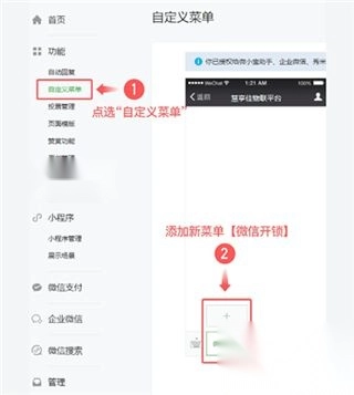 2、点击自定义菜单,然后点击添加新菜单微信开锁(菜单名字可以自定义);