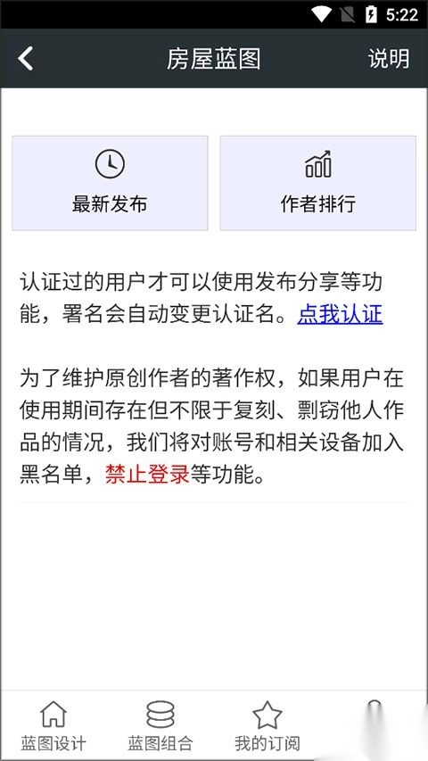3、在蓝图设计界面选择房屋蓝图,可以查看最新发布和作者排行的一些蓝图作品。