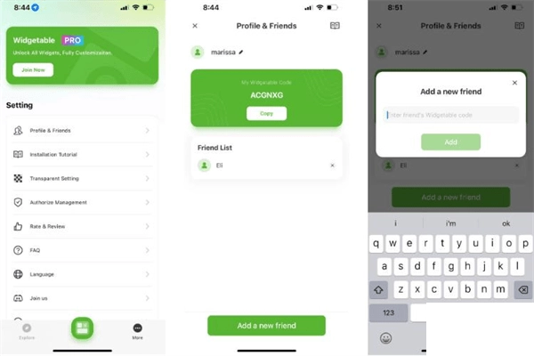 2、安装后,打开 Widgetable 应用程序并点击位于底部菜单中的更多,然后点击菜单中的个人资料和好友。接下来,点击屏幕底部的添加新朋友并输入他们的代码。你还将在此屏幕上看到你的代码。因此,请你的朋友按照相同的说明进入此菜单。请记住,你们都需要输入彼此的代码才能在应用程序内进行连接。如何设置共享的 Widgetable 小部件