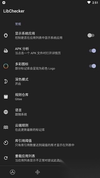 3、其次就是设置,在这里有主题背景颜色、APK分析、规则仓库、语言、云端规则等等,根据需要进行适当的调整。