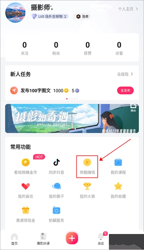 进入图虫 后,于 “我的” 界面的常用功能板块中,选择 “供稿赚钱” 选项 。