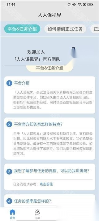 3、每一个栏中又展示了许多的内容窗口,比如在介绍栏中就提供了平台介绍、任务特点等;