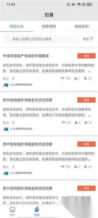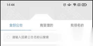 4、招募中心拥有多个管理栏,设计了全部公告、我管理的与我报名的专栏,展示不同的项目;
