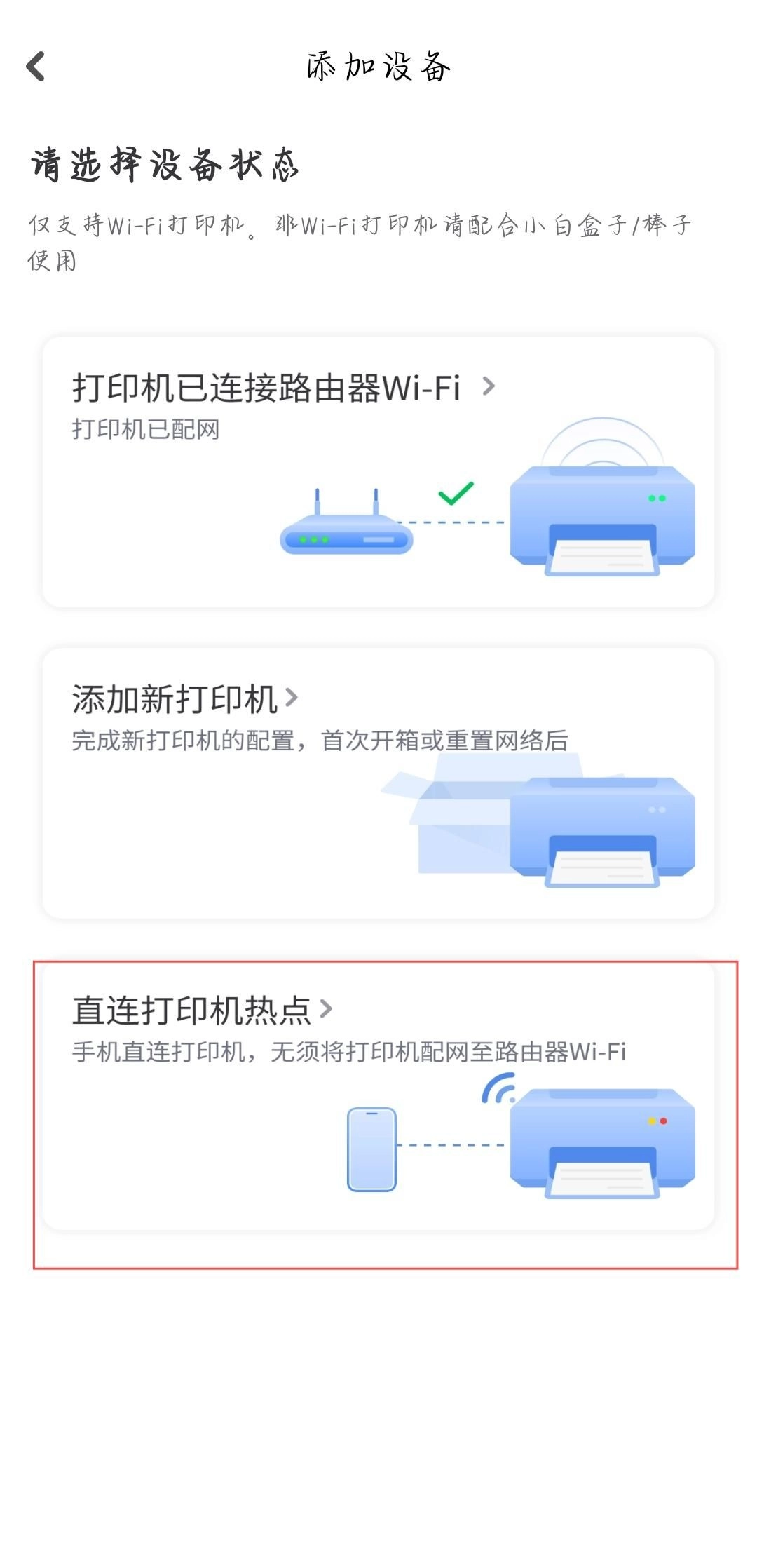 2、选择自己需要连接打印机的方式,此处以直连打印机热点为例