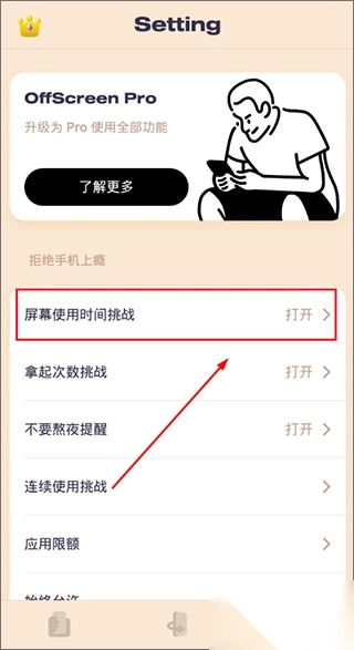 2、于【Setting】页面中,点击【屏幕使用挑战】。