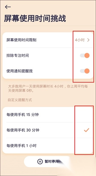 3、在【屏幕使用挑战】页面,根据自身情况来设置每天使用手机时长。