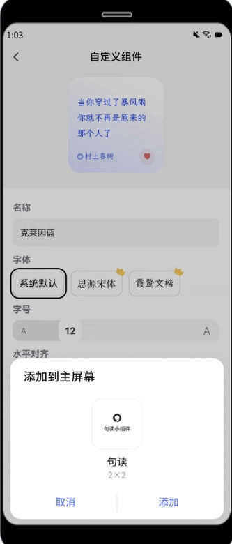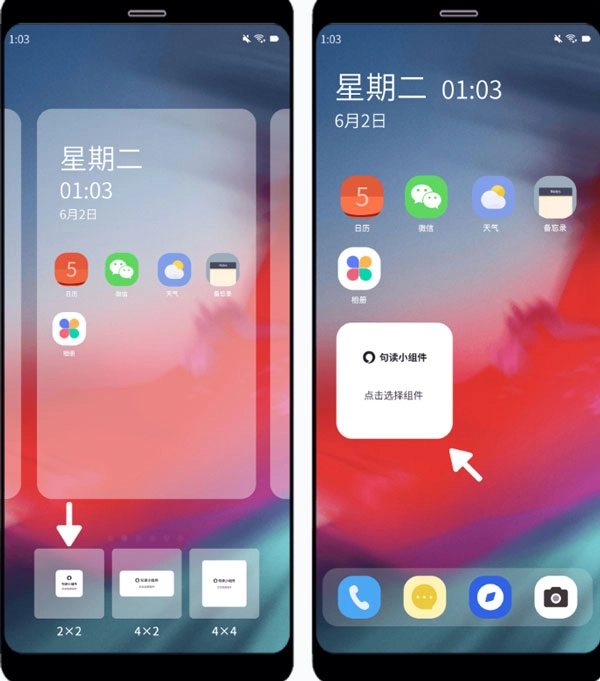 7、左右滑动屏幕,在候选组件列表里挑选尺寸合适的组件,将其添加到手机桌面上。