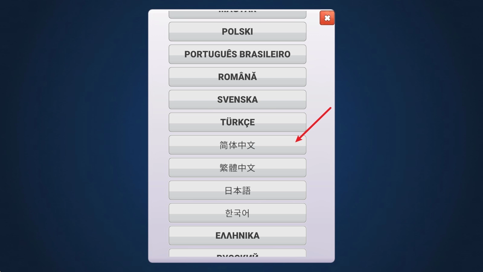 4、接着找到简体中文选项,点击进行切换,切换完成后需要重启游戏才能生效。