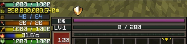 3、游戏中角色的状态栏从上到下分别是睡眠值、金钱、负重、饥饿水平、疲劳值、温度、健康值,中间的部分是血性、耐力、职业等级/职业经验、玩家等级、生命值/魔力值。