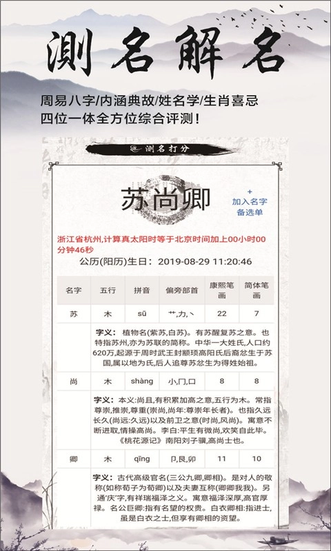 3、测名解名:含八字喜用神匹配,文化内涵典故,姓名学三才数理得分,民俗生肖喜忌,四位一体的综合姓名评测!