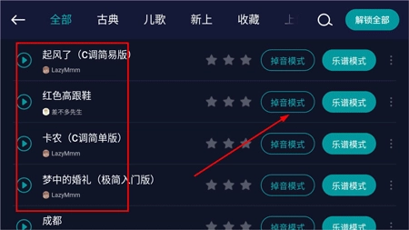 4、曲库板块,可挑选喜爱的钢琴曲,并开启不同模式进行练习。