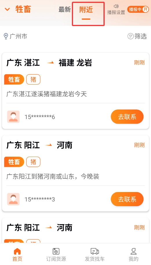 2、开启定位功能后,可优先查看周边最近的货运车辆及司机接单情况。
