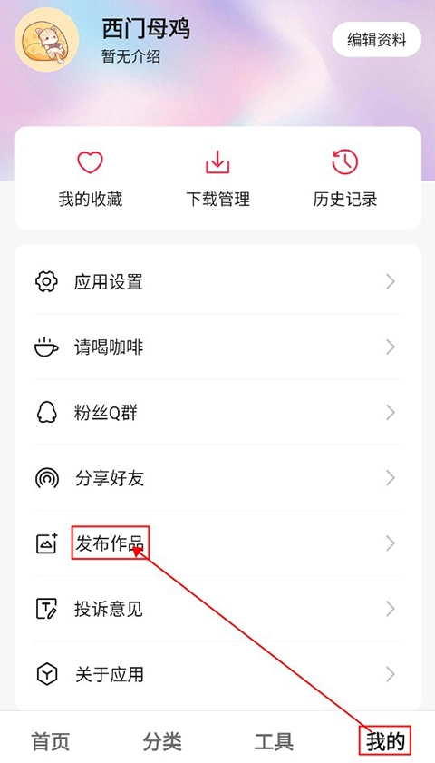 1、用户点击右下角的“我的”按钮,进入个人中心页面后,点击页面中间的“发布作品”选项,就能进入作品发布界面了。