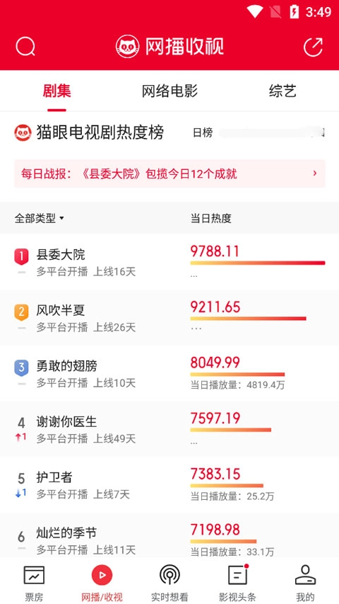2、它会为用户提供电视剧热度榜,同时也会展示当日的播放量数据;