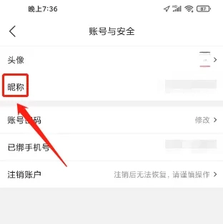 4、进入账号与安全,点击(昵称)按钮。