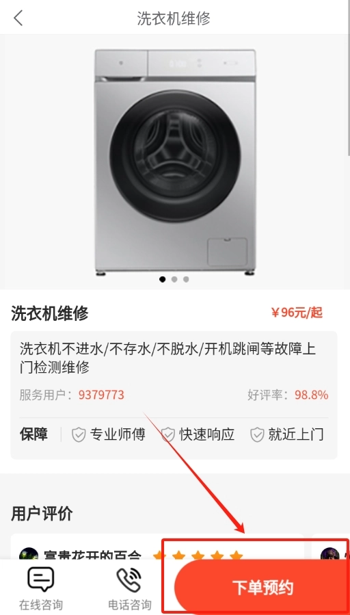3、进入相关页面,在右下角位置能看到 “立即预约” 按钮,点击它,就能顺利提交洗衣机维修预约啦。