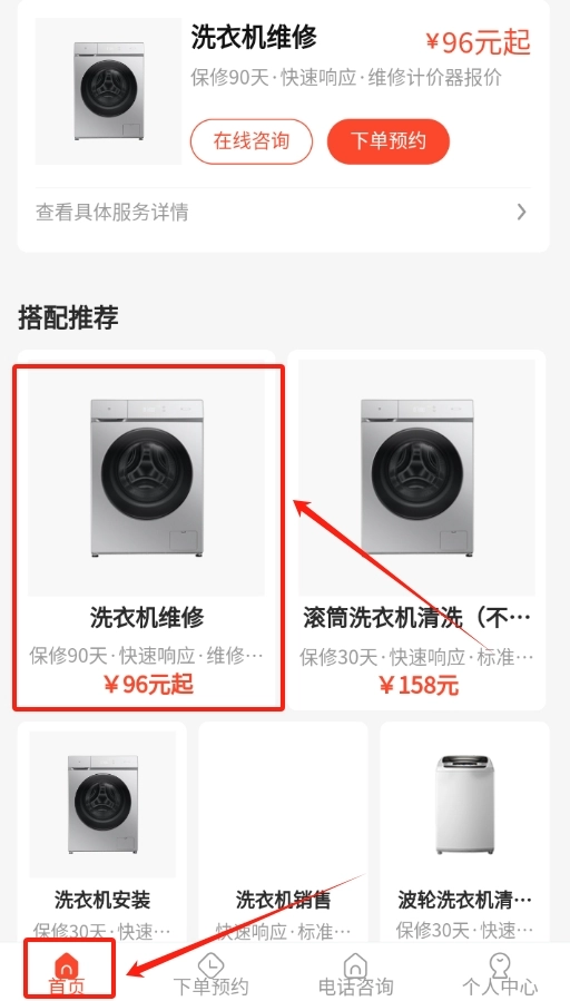 2、成功登录后回到软件首页,在众多选项里找到“洗衣机维修预约”的入口并点击。