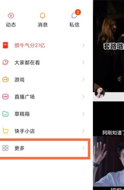1.启动快手应用,接着点击左上角的三条横线图标,随后在弹出的菜单中选择“更多功能”选项。