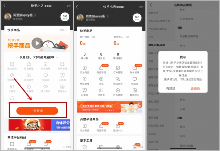 5.接下来开展商品管理工作,需选择小店对应的所属类目,并缴纳相应的保证金(不同类目的保证金金额有所差异,后续若退店可予以返还)